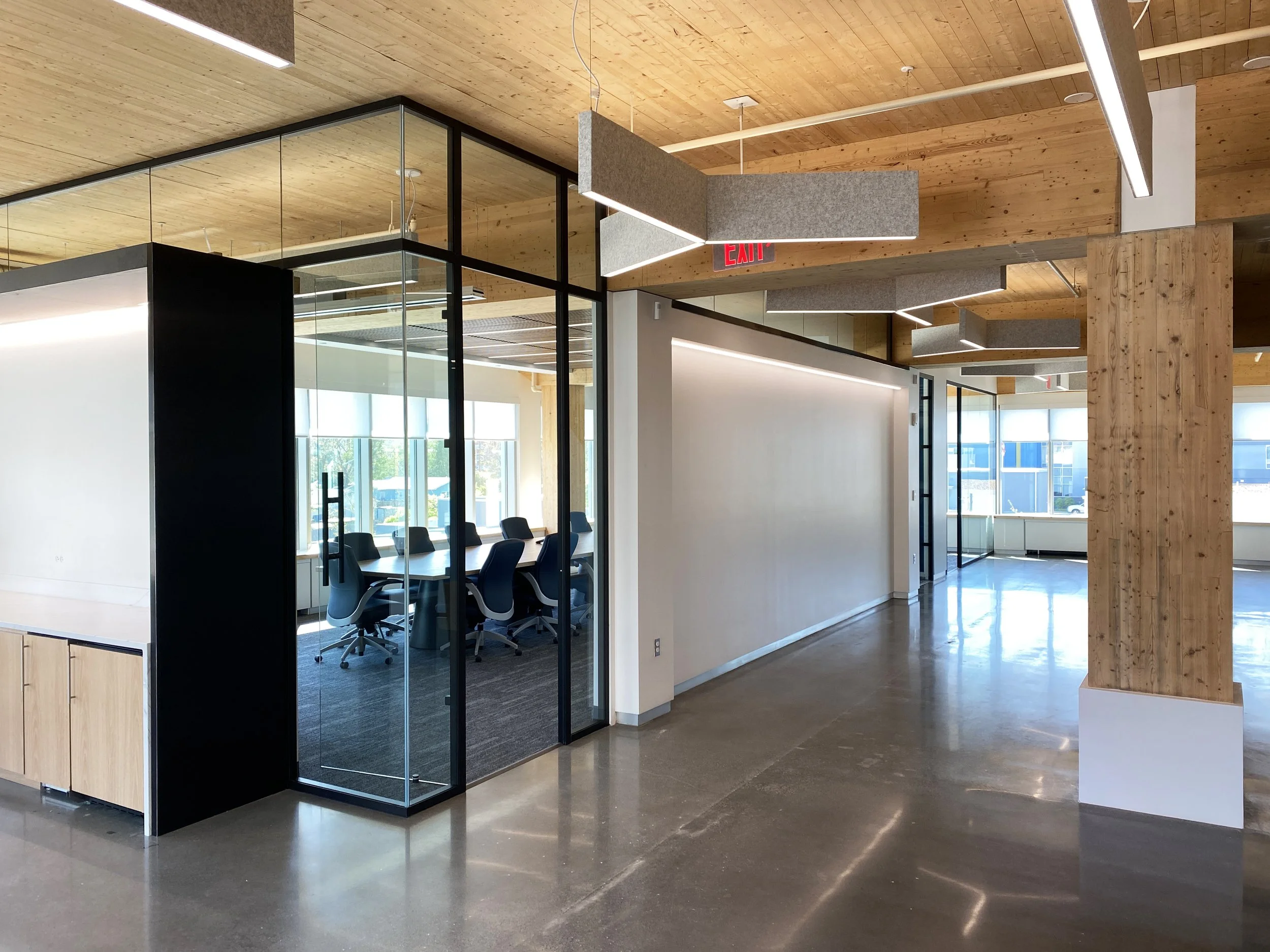 A collaborative construction company expands their presence with an office space in Charlottesville VA in state-of-the-art mass timber building. Social and communal spaces flank a shared outdoor roof terrace while a focused work environments flank the building perimeter.