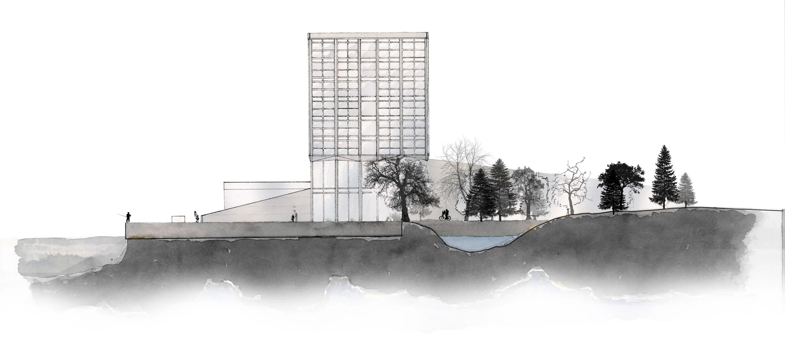 The goal of the project was to maintain the Thompson Boat House center program, while simultaneously providing a space for Teach for America Teachers to reside. The mass of the building extends over the site East-West, gaining the maximum possible exposure on the Southern facade. The geometry articulates itself as the program ascends upwards from the pedestrian level on the ground plane to the residences above. The formal language of the architecture is celebrated on the ground plane, from the water, and from within the residences.