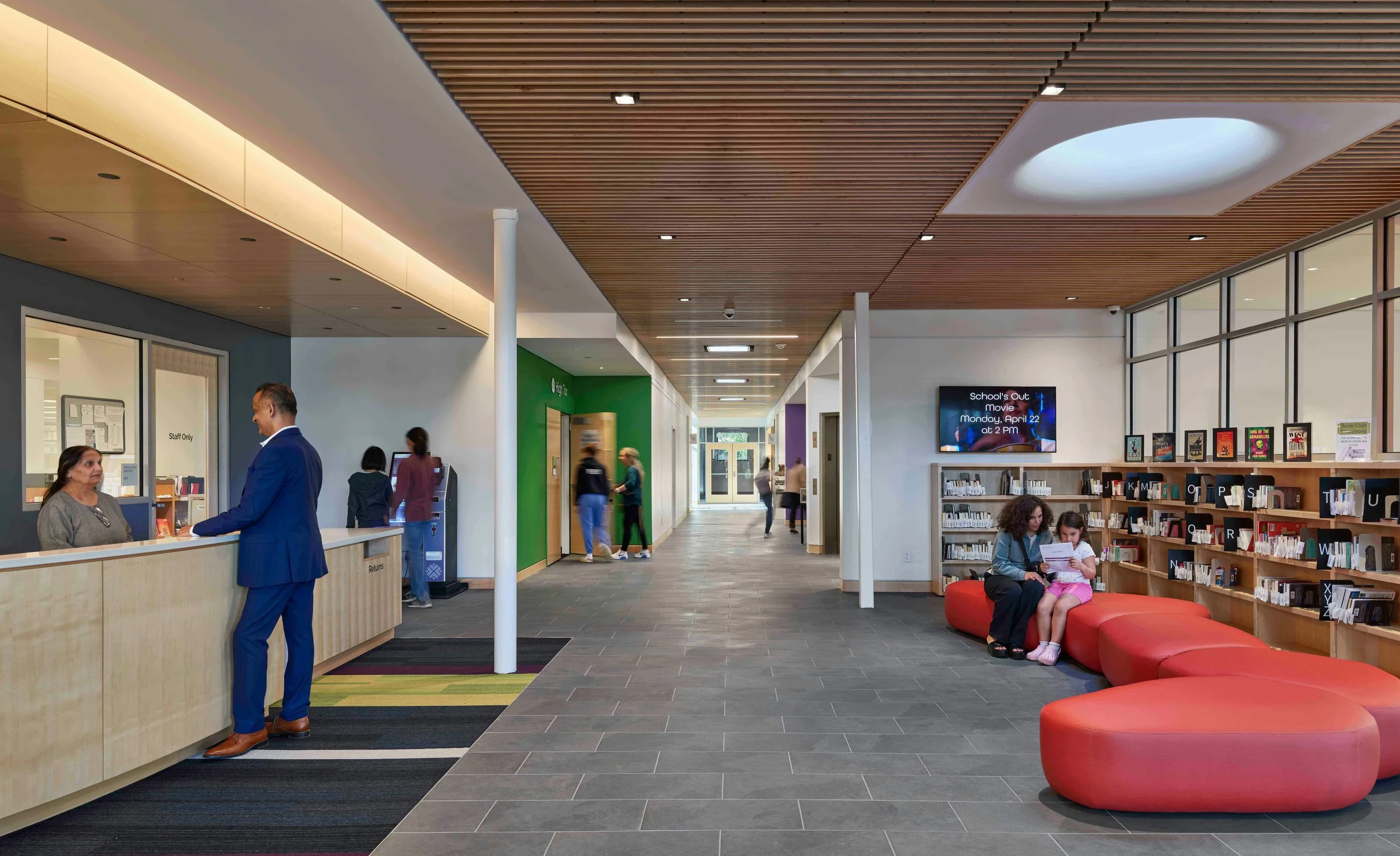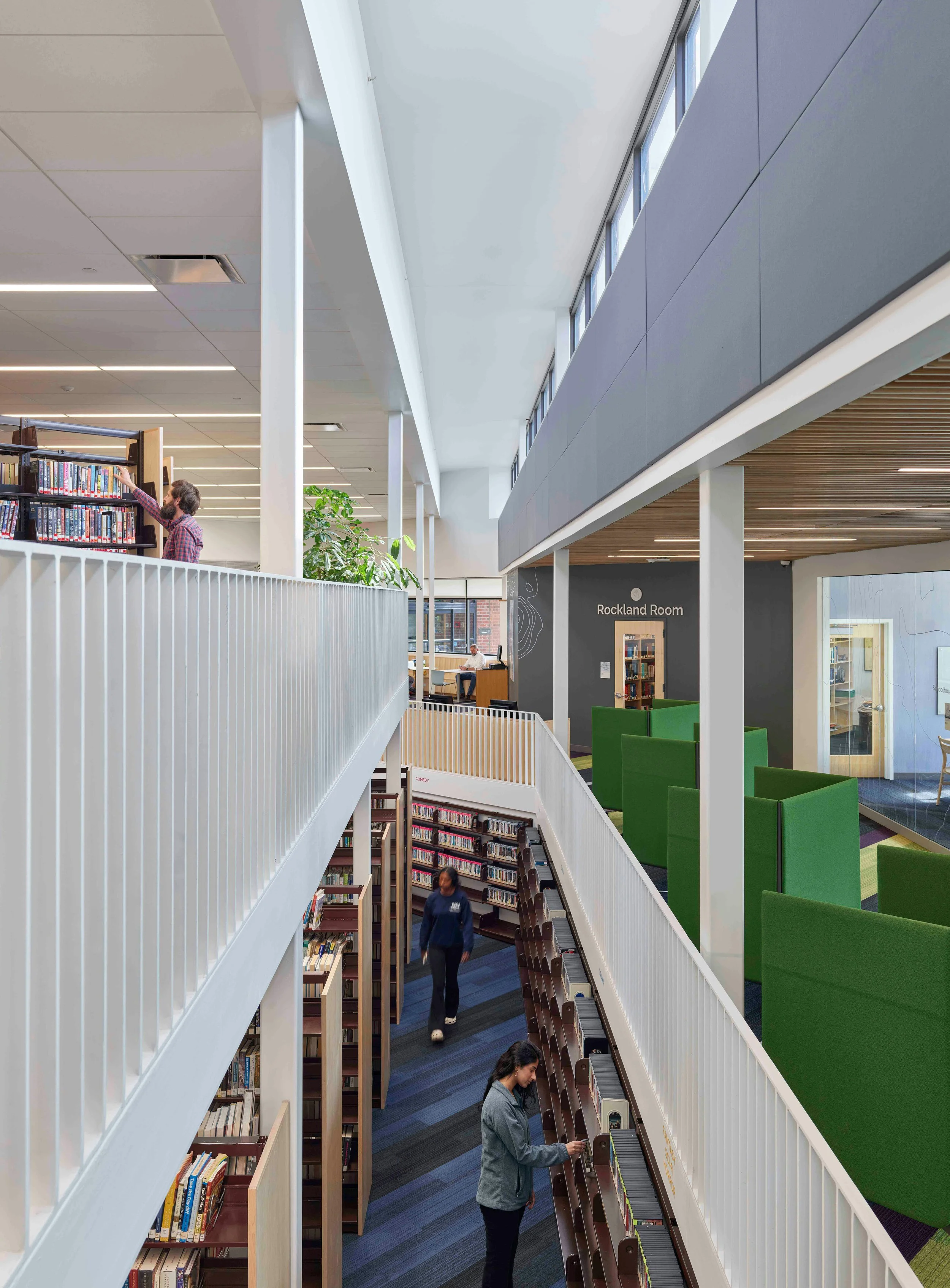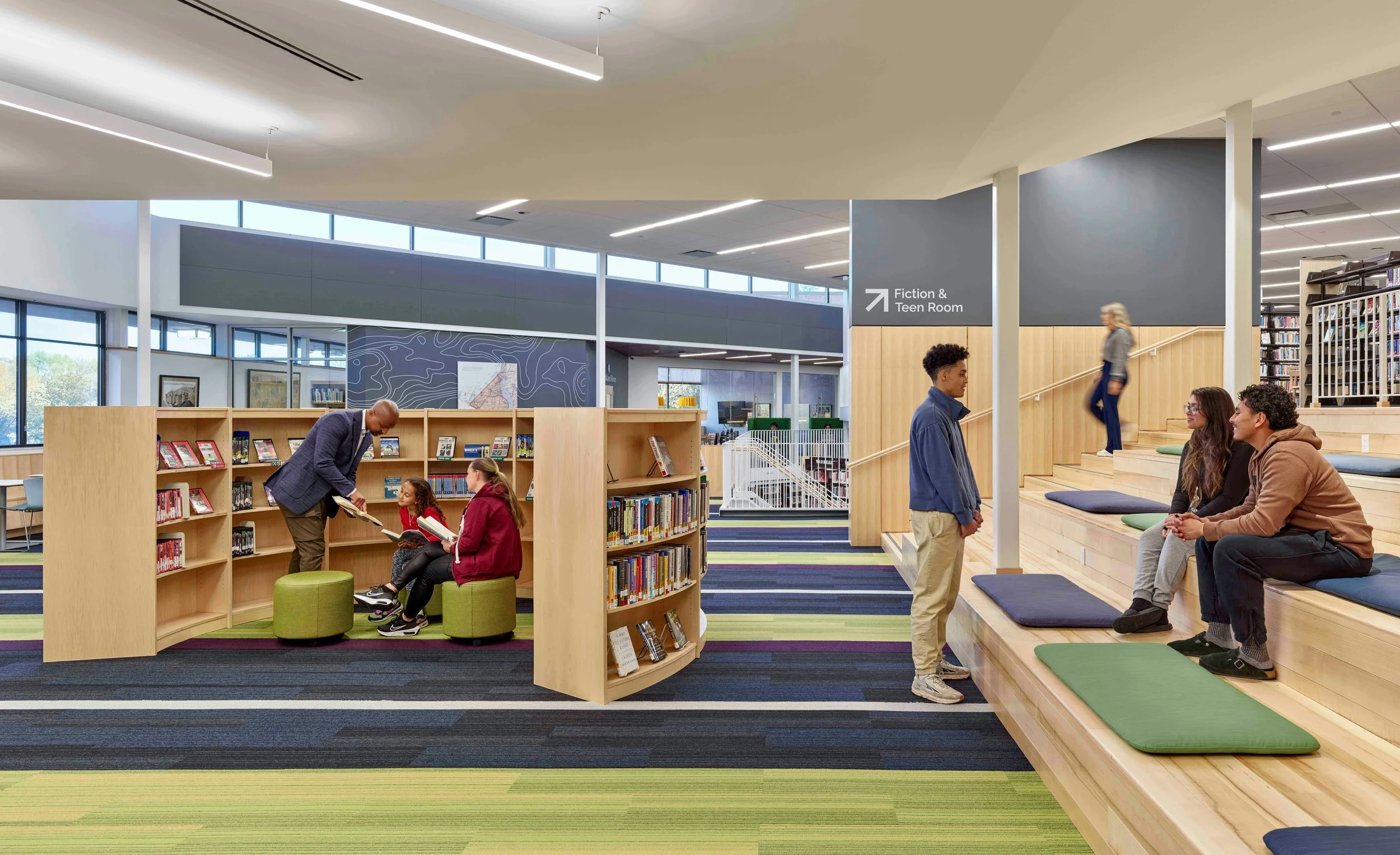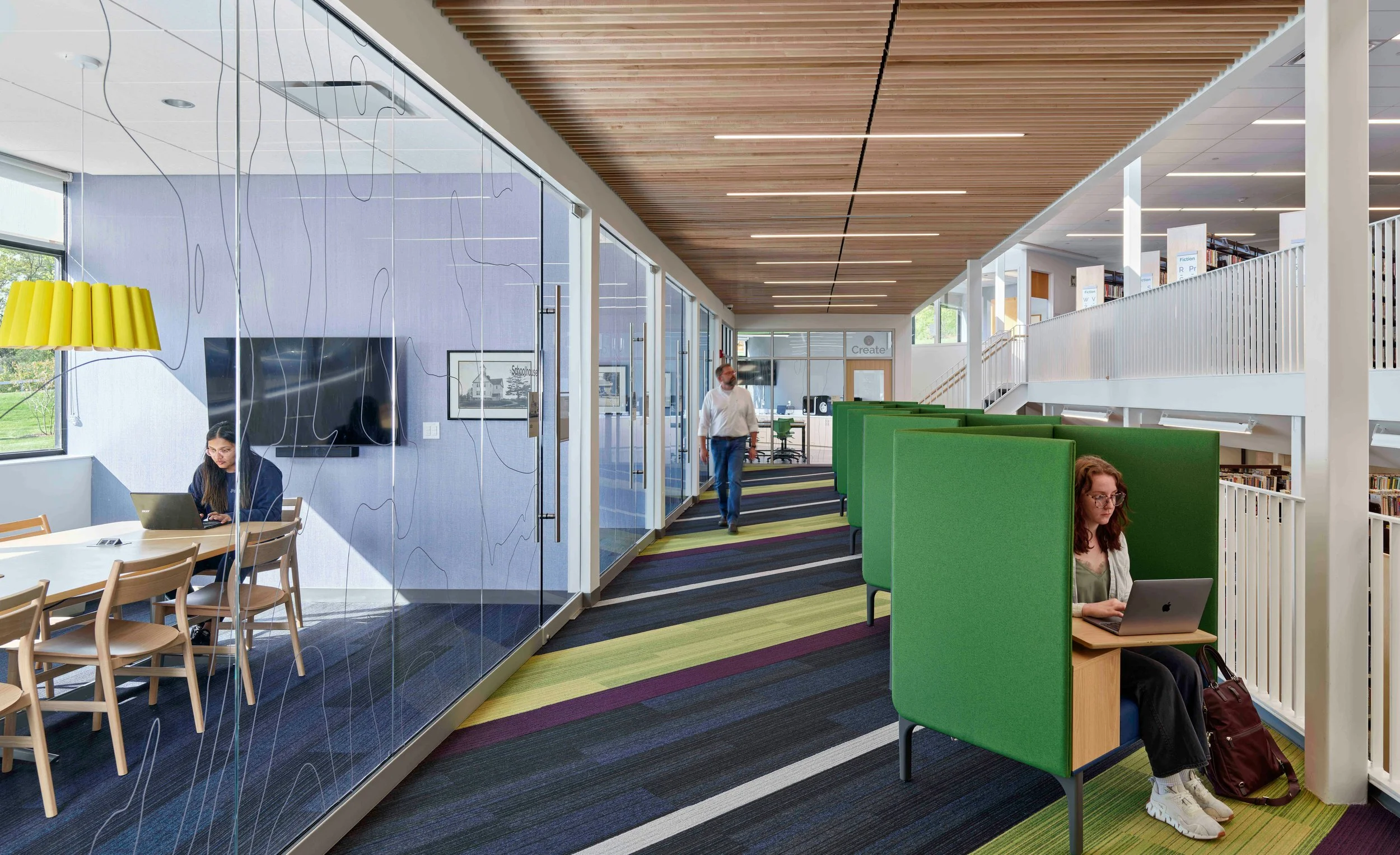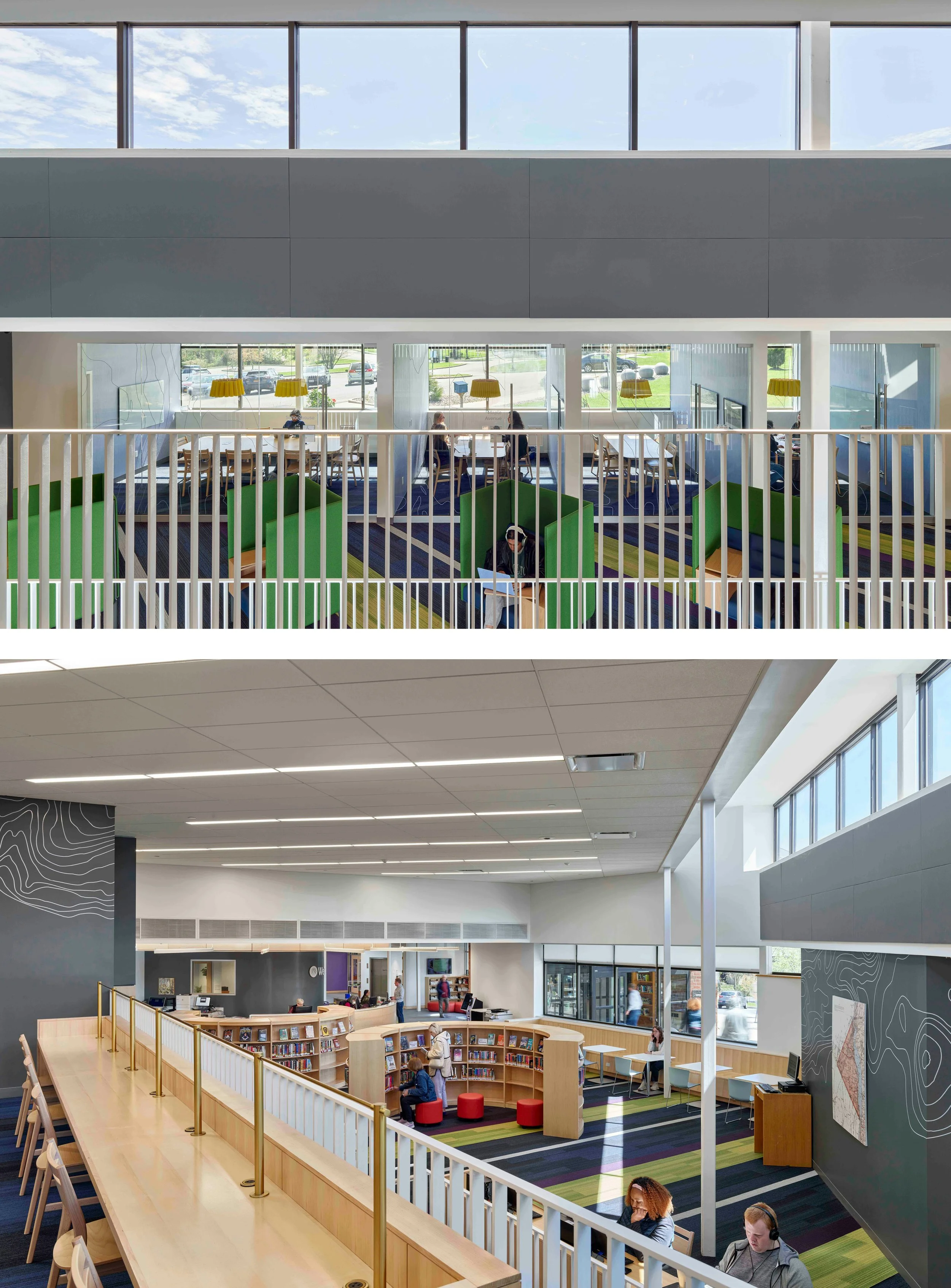 Main Level with open collaboration, group study, forum seating, and mezzanine beyond.
